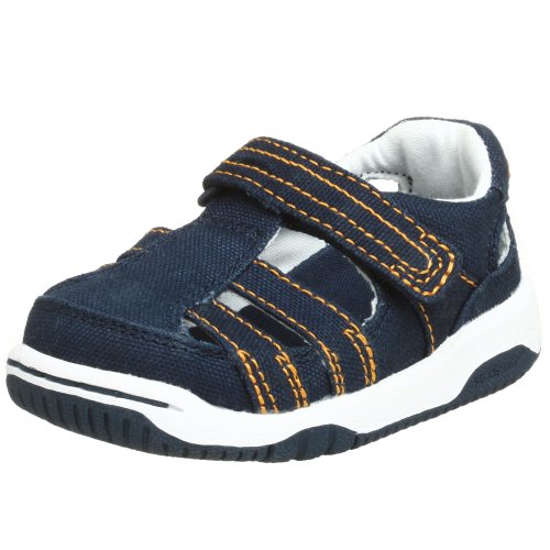 Hook, line and sinker, they'll love these Fisherman sandals by Stride Rite. Durable canvas fabric upper in a casual fisherman sandal style with a round closed toe. Contrasting trim adds a touch of sporty detail. A T-strap vamp with instep strap featuring a Velcro(R) closure keeps fit secure. Fabric lining and cushioned removable logo footbed, flexible rubber midsole. Textured rubber outsole with a wrap toe bumper and flat heel.